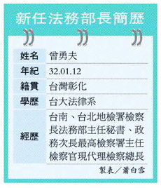 曾勇夫是司法官十一期結業,台大法律系畢業,跟前法務部長陳定南是大學同學;曾擔任法務部政務次長,民進黨執政後,調任最高檢察署主任檢察官,今年一月十九日,陳聰明請辭檢察總長,他代理總長,如今又被發布擔任部長,短