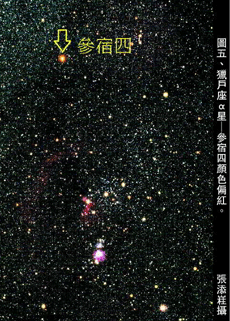 注意觀察,星星會有不同的顏色喔!星體之顏色與星體表面溫度和年齡(生命週期)有關,如紅色星體約3000°,已經是「老公公星星」了;黃色星體約6000°,可以說正值中壯年;青白色星體約10000°以上,大概是星星國裡的小老弟呢。(見圖五、獵戶座α星-參宿四顏色偏紅-張添嵀攝)