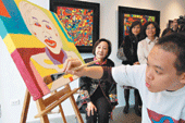 【本報台中訊】二十歲自閉青年李柏毅,從小在美國被鑑定為美術天才,作品色彩繽紛、天馬行空,贏得不少好評;昨天他應邀為台中市長夫人邵曉鈴作畫,古典美的邵曉鈴在他筆下,變成鮮豔明亮的「普普」女郎,市長老公胡志強說「要買下來收藏」。(聯合報記者洪敬浤攝)