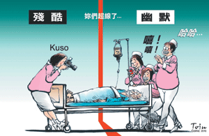 一位老人家罹病在病床上受難,最需要減緩病痛與心理苦楚,但原本應該照顧、安慰與鼓勵老人家的護士,卻變成戲弄病人的冷血「調侃者」,年輕人的kuso,原本是搞笑好玩,可是玩到不顧身分與不知分寸,這就是「超過」,不是幽默而是殘酷。