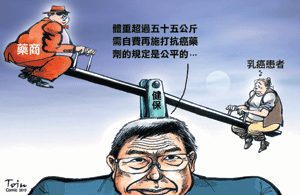 高醫大乳癌權威侯明鋒醫師說,健保資源有限,所以要「斤斤」計較,話說得沒錯,但卻搞錯了計較的對象。健保局該計較的是生產「賀癌平」的藥商,這項藥品納入健保給付,一劑收費高達六、七萬元,以一年打十三針劑計算,費用約八、九十萬元,形同藥商的「金雞母」,健保局若能和藥商議價,將單劑價格壓在五萬元內,就算患者體重超過五十五公斤,需要多打幾針,也在預算之內,根本不需要患者自費。