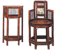 家具材質是最能突顯台灣傳統家具特色的地方,早期的家具師傅除了喜歡選用台灣山區盛產的樟木、紅檜、楠木、烏心石、台灣杉等木材外,也常常運用竹材來展現濃濃的海島風味,他們運用燒烤或削剖的技巧,將竹材加以彎曲組合,然後搭配巧妙的榫接技術,便製作出了一張張雅致的竹椅、竹桌、竹櫃……竹製家具完全不需另外上色,竹材本身的淡淡的嫩青光澤就很清爽迷人。