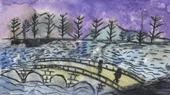 1.從風景照片上找出「地平線」,運用炭筆畫出天空與地面,再逐一描繪遠景〈遠山、樹木〉→中景〈船〉→近景〈河岸〉的輪廓與線條紋路。