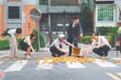 短片中,一名路人將水果打翻一地,在公車站等車的學生及上班族,皆主動前往幫忙撿拾。人間社記者蘇莉萍攝