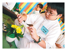 課程包括許多有意義的活動,抄經、畫佛像讓兒童學習專注、紀律與感恩;也從撿豆活動中,學習用心去操控選豆的手,不讓放豆的碗發出擾人的聲音;還通過插花,表達對菩薩的恭敬。