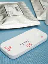 最新研發的腸病毒71型快檢試劑,則將檢驗時間縮短至二十分鐘,疾管局研究檢驗中心主任吳和生指出,試劑外觀類似驗孕棒,同樣出現兩條紅線代表為「中獎」的陽性,由於檢體來自抽血離心後的一滴血清,因此未來在醫療院所都便於使用。