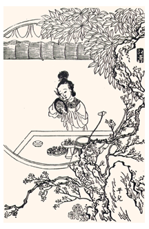 以改琦所繪的「平兒理妝」(四十四回)而言,這起事件肇因於賈璉偷腥,為鳳姐發覺,兩人大鬧時,皆打平兒出氣,受委屈的平兒只有躲進大觀園落淚,寶玉則趁機接進怡紅院,協助其補妝。