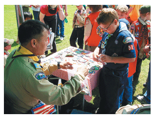 圖說:美國幼童軍至佛光童軍攤位前,與Joeseph Ng交換紀念章。