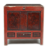 此件蓋頭櫃應為中部地區樣式,採用朱漆與墨繪的裝飾型式,尤其水墨白描裝飾技法的運用,十分圓熟而典雅,整體顯現出既莊重又樸實素雅的文風,更是獨具特色的台灣早期家具。