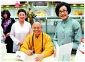 台北道場十二日舉行八關齋戒會,功德主薛正芳(左二)贈送戒子,每人一本「幸福DNA」,作者心定和尚(右二)為新書簽名。人間社記者陳秋玉攝