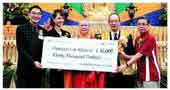 多倫多佛光山贊助多倫多大學社會工作系譗協助華裔新移民研究計畫豃,住持覺初法師(中)和多倫多協會長蔡堅宜(右二)捐贈三萬元支票,由多倫多大學社會工作學院助理院長Eileen McKee(左二)和曾家達教授(左一)接受。人間社記者轉珀攝
