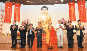 典禮首先由心定和尚帶領基金會蔡董事長及董監事一同向諸佛菩薩獻燈祈福,接著帶領大眾一同虔誠誦經、念佛、祈福回向;在一片莊嚴深遠的佛號聲中,只見大眾神情肅穆,雙手合十,發自內心的誦經、唸佛聲響徹佛殿,直入人心,有幾位家屬一時難忍思親悲情,不由得潸然淚下;最後,在佛光會義工的引導下,大眾循序至佛前,一一向佛菩薩獻燈,祈願祝禱。