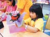 新加坡學童在Ann老師的教導下,學習如何將塑膠花等環保材料,包成一束美麗的花。人間社記者日京攝