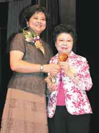 國際佛光會南雅分會會員董黃春媛(右)獲頒板橋市義工服務鑽石獎第一名,昨日由板橋市長江惠貞表揚。圖/人間社記者郭貴娟