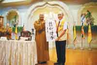 國際佛光會中華總會創會會長星雲大師(左),頒發墨寶譗信仰傳承豃給中華總會副總會長陳嘉隆。人間社記者江峰平攝