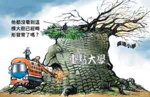最教人難過的是「頭重腳輕」的教育預算分配邏輯,同樣生活在台灣,偏遠地區的小學甚至沒有圖書館,得靠民間菜販五元十元的存下來幫忙蓋,重點大學可向政府大筆要錢,政府想少給一點還會被譴責,就百姓的角度來看,那些廟堂之上的高級知識份子,比不上一名菜販。