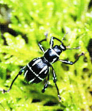 正當停好機車想到海岸林中走走,就發現在棋盤腳樹的葉子上,有個小東西在移動,靠近一看才知道是族群數量不多的斷紋球背象鼻蟲,體型不大的牠只有一點二至一點五公分左右,但是身上美麗的金屬藍色條紋卻讓牠變成顯眼的移動寶石,本種與條紋球背象鼻蟲最大的差異在於,本種前胸上不具有橫向條紋,背上中間的橫向條紋有中斷為最大的辨識差異。