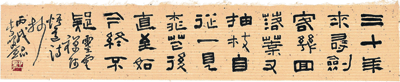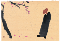 附圖為作者簡筆水墨「見桃悟道」,隸書靈雲禪師悟道詩抄。
