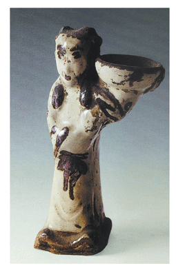 比較有價值的油燈帶有動物、人物的造型,或者是比較少見的形制。此燈的造型樸拙,仕女手托燈杯於肩的一側。整體以寫意的手法簡略地畫出五官及身體的結構,在似與不似之間。