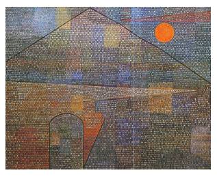 克利在預先舖設的各種不同色塊的底基上,像鑲嵌的瓷磚,一塊塊、一片片小心地貼上,他利用明暗差的明度階,秩序地統和協調出多種音節、多重音色所經營出的奇異妙美的色彩大觀園,步入其間,如同沒入浩瀚的天地舞池,盡情享受華麗而抒情的色彩旋音和夢幻光影相互交響、交感而成的宇宙奏鳴曲。