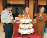 慶祝佛光童軍團十周年,國際佛光會中華總會署理事長慈容法師(中)、秘書長覺培法師(右),與大眾一起唱生日快樂歌。圖/人間社記者林文輝