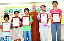 【記者郭書宏台北報導】「全民行三好,好心會放光!」第七屆國際佛光緣小藝術家獎昨舉行頒獎典禮,從八千四百多件參賽作品脫穎而出的百餘名小藝術家,分別從北、中、南、東部各地齊聚國父紀念館受獎。得獎作品即日起至二十六日,在國父紀念館文化走廊展出。