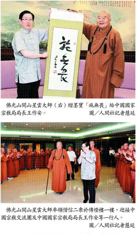 王局長表示,大師對於人間佛教的推展,幾十年來不遺餘力,如日前舉辦的第六屆海峽兩岸圖書交易會中,首度舉行的「兩岸宗教出版物聯展」;二○○二年由大師簽頭,兩岸共同「恭迎佛指舍利到台灣」造成五百萬人瞻仰的盛況;二○○三年率團參加「海峽兩岸暨港澳佛教界為降伏『非典』國泰民安世界和平祈福大法會」;二○○四年與大陸佛教聯袂組成「中華佛教音樂展演團」至港、澳、美、加巡迴;二○○六年於杭州舉行的首屆「世界佛教論壇」,大師為八大倡議人之一;乃至二○○七年「和平鐘聲到台灣」;二○○八年「汶川大地震」佛光山、國際佛光會第一時間捐助第一筆款項並展開救援活動;二○○九年「第二屆世界佛教論壇」於無錫開幕,台北閉幕,在在開創兩岸文化交流的新模式。