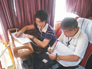 為方便旗津六十五歲以上的信眾參加考試,特別在旗津布教所設考場,由覺亮法師念誦題目讓長輩們作答。