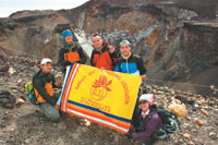 林志文(左起)、李建隆、方志偉、李靜波、吳璧娟等佛光青年,日前成功登頂富士山,展開佛光會旗,在富士山火山口前合影。圖/李維國提供