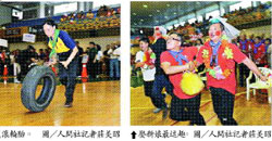 「眼明腳快」是踩汽球比賽,裁判哨音一響,只見你踩我、我踩你,有的眼花踩到自己汽球,也有誤踩隊友的烏龍場面。「法輪常轉」是推輪胎競賽,過程刺激驚險,有的發生「車禍」,輪胎撞在一起;也有的人跌趴地上,輪胎反而自動滾回去,趣味橫生。