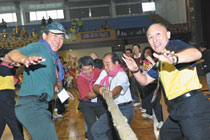 重頭戲拔河比賽,按標準競賽規則進行淘汰賽,每當裁判哨音一起,「殺、殺」響震全場,連一旁觀戰的啦啦隊都喊到失聲。有的隊伍一翻兩瞪眼,即刻見高下;有的形成拉鋸戰,不分軒輊。經過三戰兩勝制對抗,終見分曉。