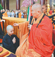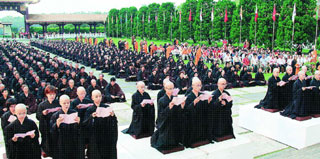 【人間社記者陳秋玉大樹報導】鐘鼓齊鳴震響天際,「佛光山二○一○甘露灌頂三皈五戒暨出家典禮」昨天在成佛大道盛大舉行,歐、美、亞、非、澳等全球五大洲、五十多個國家、逾千位佛光人,由佛光山開山星雲大師、佛光山寺住持心培和尚、福慧家園住持慧昭法師三大師傳授三皈五戒;同時,慧屏法師等二十一位徒眾、兩位師姑,在星雲大師剃度、入道儀式下,成為佛光山弘法生力軍。