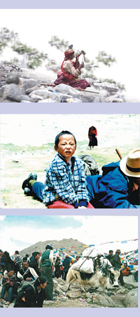 在轉神山岡仁波齊峰的沿途路上,經常可看見絡繹不絕的朝聖者,尤其是二○○二午馬年更是多到要排隊呢!虔誠的藏人在轉山時,許多人都是用「磕長頭」的方式,前往瞻仰祂的聖容。
