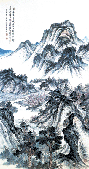 此圖乃經過巧思構成描寫陶淵明桃花源之意境。岩皴法嚴密,桃花和人間景色相映成趣;松柏蒼翠,路徑曲折蜿蜒,遠山含笑,進入桃花源別有洞天。
