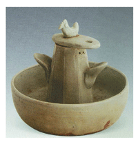 青瓷始於南朝,興於北宋,盛於南宋。一般來說,青瓷的發源地在浙江紹興,古稱越州,而以龍泉為其生產的中心。古代龍泉名窯是宋代「官、哥、汝、定、鈞」五大名窯之一,青瓷以瓷質細膩,線條明快流暢、造型端莊渾樸、色澤純潔斑斕為特點。該燈有一個較大的碗形燈座,而燈座也比較粗壯。燈柱上的鳳鳥雖然較小,卻是畫龍點睛之筆。