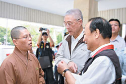 蘭陽仁愛之家主任覺方法師(左)昨天前往蘇澳關懷災民,巧遇總統馬英九及行政院長吳敦義(中),覺方法師代表佛光山開山星雲大師表達關心之意,並允諾全力協助救災。圖/人間社記者徐士閔