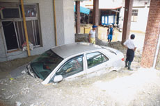連日豪雨從山坡上沖刷下來大量土石,淹進宜蘭蘇澳市區民宅,積水退後,許多民眾住家門口的轎車仍被埋沒在土石堆中,讓災民只能無奈地等待救援。文/記者羅智華 圖/記者邱麗玥
