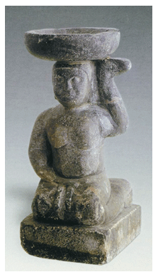 侍者裸露上身,跪於座上,一手放於腹部下面的腿上,一手扶住頭頂的燈盤。造型完整,沒有精細的雕刻。從戰國秦漢以來,比較多見此種造型的油燈,如戰國的「跽坐漆繪燈」(河南三門峽上村嶺出土),顯然,這種油燈一般都是用於祭祀或供奉的場所。