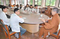 與叢林學院院長永固法師座談時,由院長導覽,介紹叢林學院「悲智願行」因緣院史外,也對在叢林學院進修對未來出路的好處,既可增長智慧、發揮所長,又可以學習佛陀精神度化有緣眾生,鼓勵學員把握因緣,到叢林學院就讀及做義工。