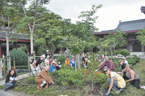 東一、中區和英文分會則在成佛丹墀花園整理雜草,一些雜草根淺易除,一些則根深難除,大家從而體悟「時時勤拂試,莫使染塵埃」之涵意,讓守護自心,不要讓惡習根深柢固,而難以清除。