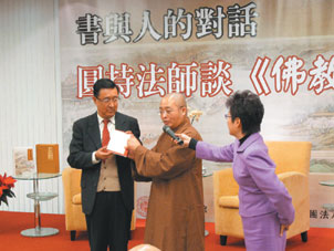 話」講座,中國佛教圖書文物館館長圓持法師耗費二十一年完成《佛教倫理》,在台灣出版正體版,現場包括國際佛光會中華總會秘書長覺培法師、法鼓佛教學院院長惠敏法師、賢德惜福文教基金會董事長周荃、國家圖書館館長顧敏等一百多位愛書人參加。
