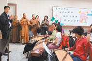 隨後,轉赴各班參觀上課情形,駐足於古箏班聽學員彈奏台灣民謠、熱情的太鼓班學員除特別演出外,還要求與貴賓合影。