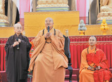 佛陀紀念館前聚集逾二萬信眾參與修持活動,佛光山開山星雲大師於佛陀紀念館前為大眾開示,由長老慈惠法師(左)台語翻譯,右為南京棲霞古寺住持隆相和尚。圖/人間社記者莊美昭
