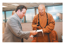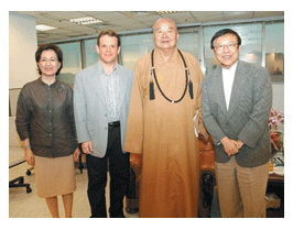 圖說:《志工企業家》作者大衛.伯恩斯坦與佛光山開山星雲大師展開座談。會後大衛.柏恩斯坦拿一本大師的著作,請大師簽名。記者邱麗玥攝