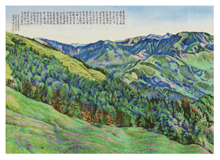 構圖空間層次由近而遠,視覺幅度由草坡、山谷,而至高處不勝寒的顛峰和悠遠的蒼穹,何其美哉!又何其壯哉!為此,我題詩落款:
