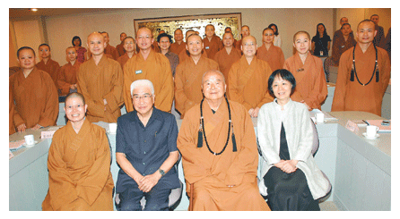 圖說:人間福報創辦人星雲大師(前右二)宣布聘請柴松林(前左二)接任社長兼總主筆、涂明君(前右)任總編輯後和原任社長永芸法師(前左)與佛光山全體宗委合影。記者邱麗玥攝