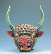 在西藏,這種閻摩面具(俗稱牛頭馬面)有寺院與民間之分。寺院的面具用於宗教儀式,而民間的面具則用於戲劇或節日表演。一般來說,寺院的面具製作更加精良,在技術和材質上都優於民間面具。這件閻魔面具為寺院用具,平時掛在牆上作為護法,從造形到細部製作都很精細,表現出很高的藝術性。