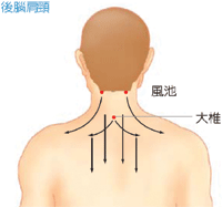 1.由後腦風池穴斜刮肩胛穴區帶。