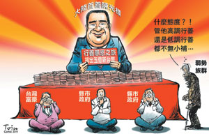 拒絕陳光標當面發放慰問金的縣市政府官員,你們領的薪水相對一般勞工較優渥,沒有生活壓力,為何不替低收入戶、弱勢族群想想?難道被指責「不食人間煙火」及「不苦民所苦」還不夠嗎?如果真是「正在接洽中,並沒拒絕」,就請再思考配合,讓貧苦民眾能過個溫暖農曆年。