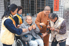 長者及親屬們看到佛光山法師與佛光會幹部,親切的關懷及閒話家常,不禁紛紛表達感謝,有的老人家竟流下感動的眼淚。